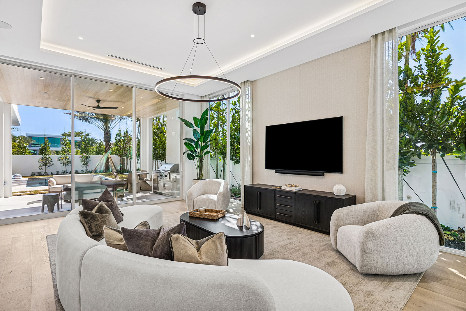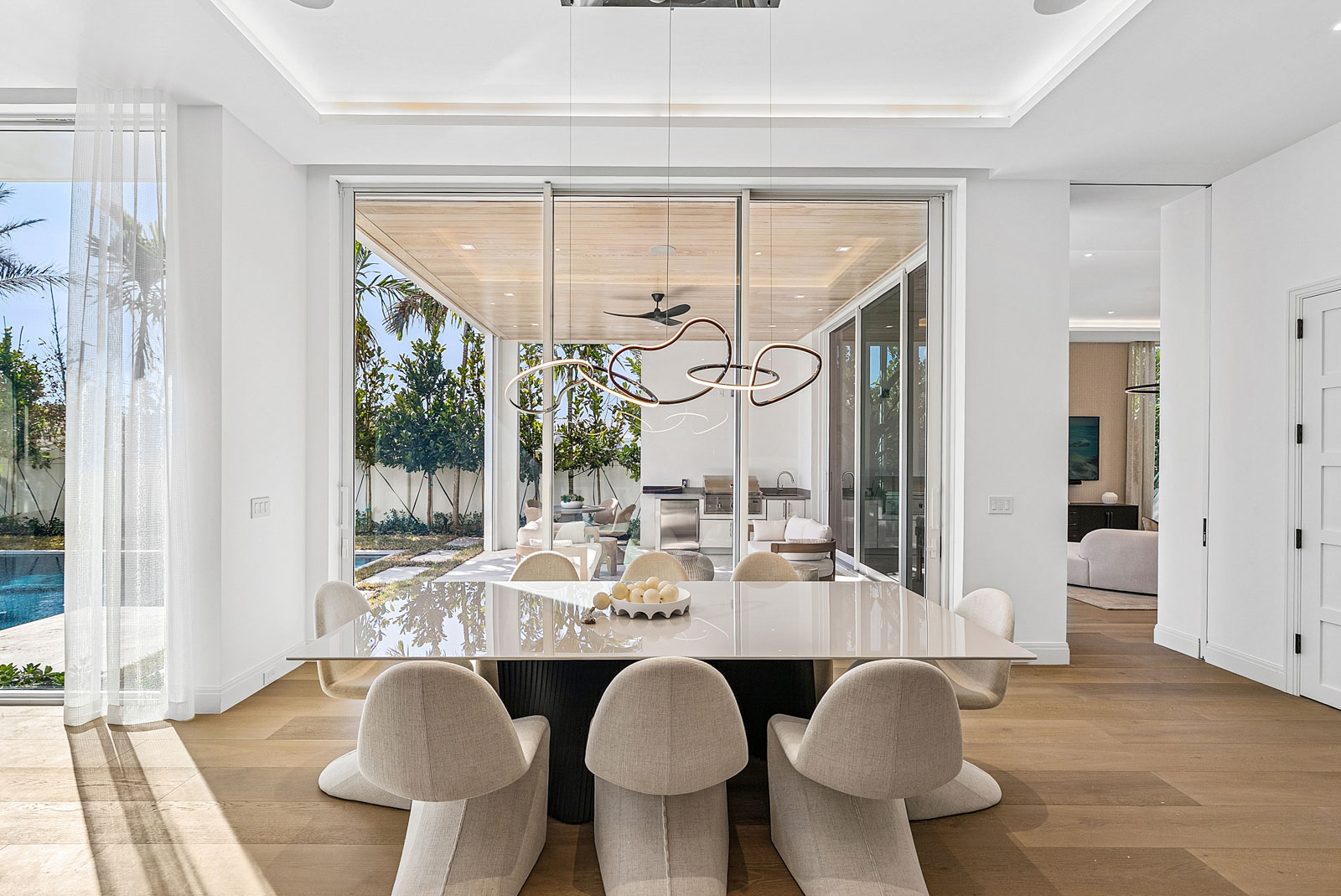 Large covered outdoor entertaining area with full summer kitchen and T&G ceiling with hidden pockets for automated screens