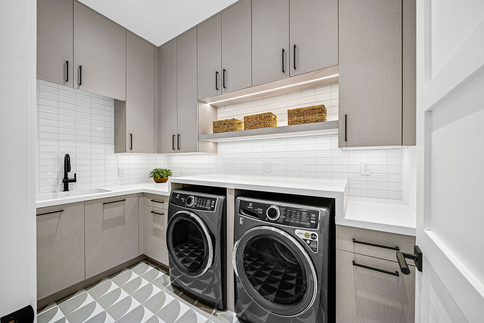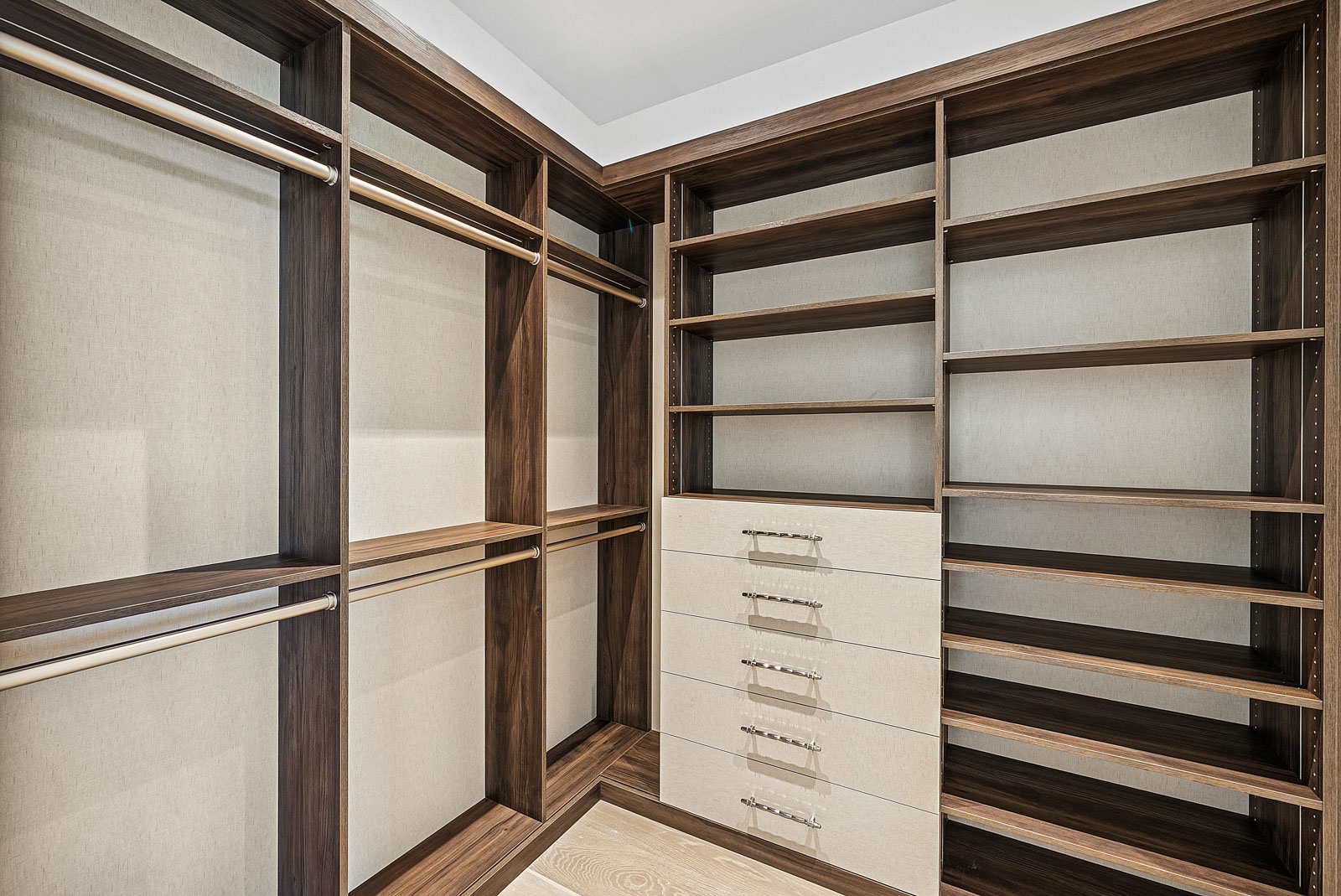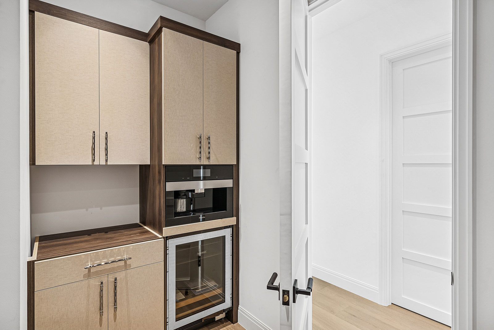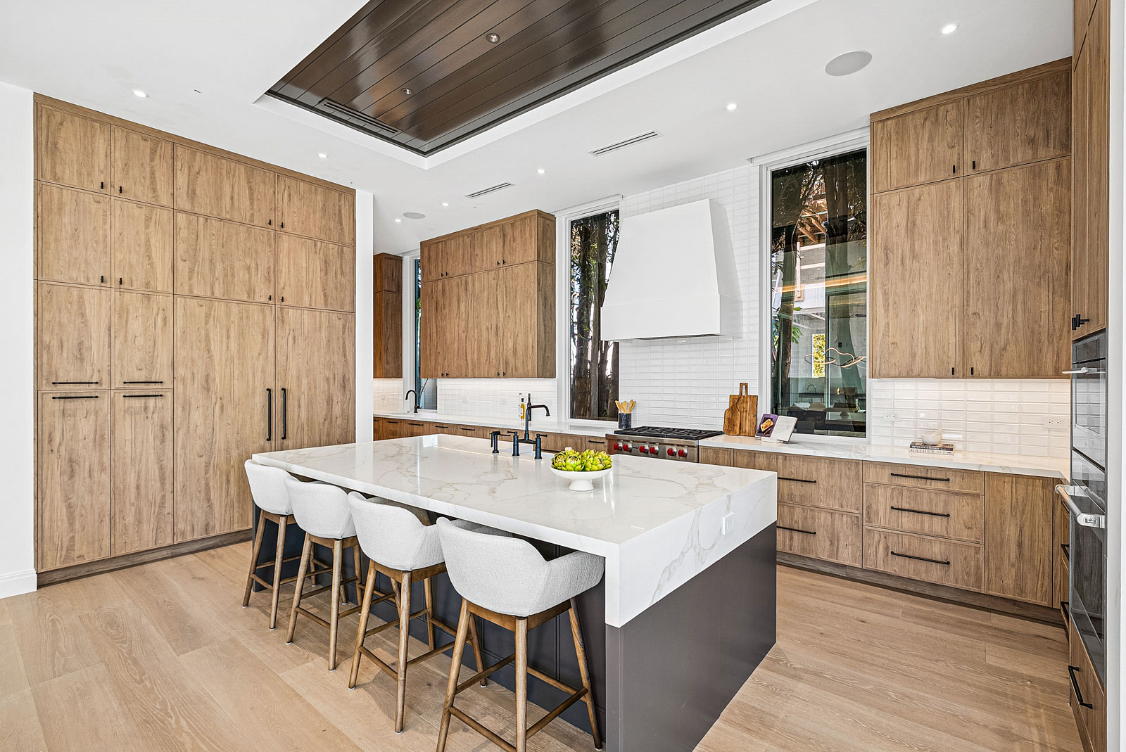 Kitchen features Wolf and Sub Zero appliances, 12’ floor to ceiling cabinetry and service kitchen with walk-in pantry