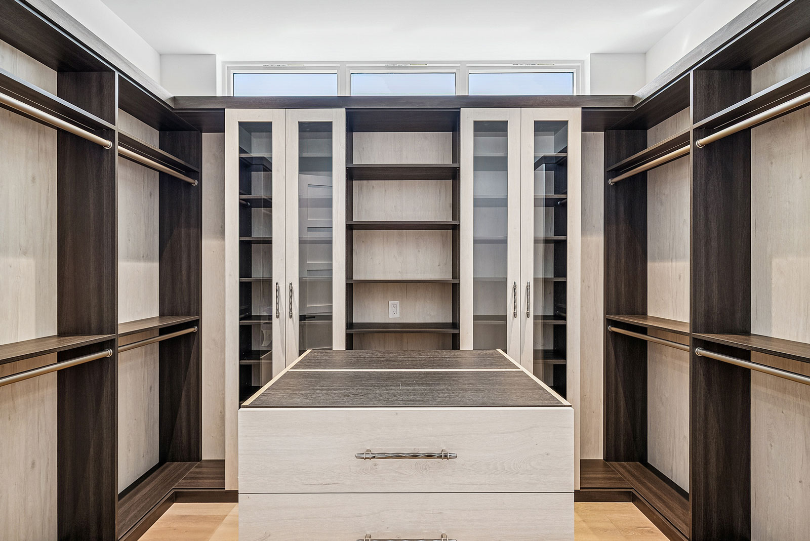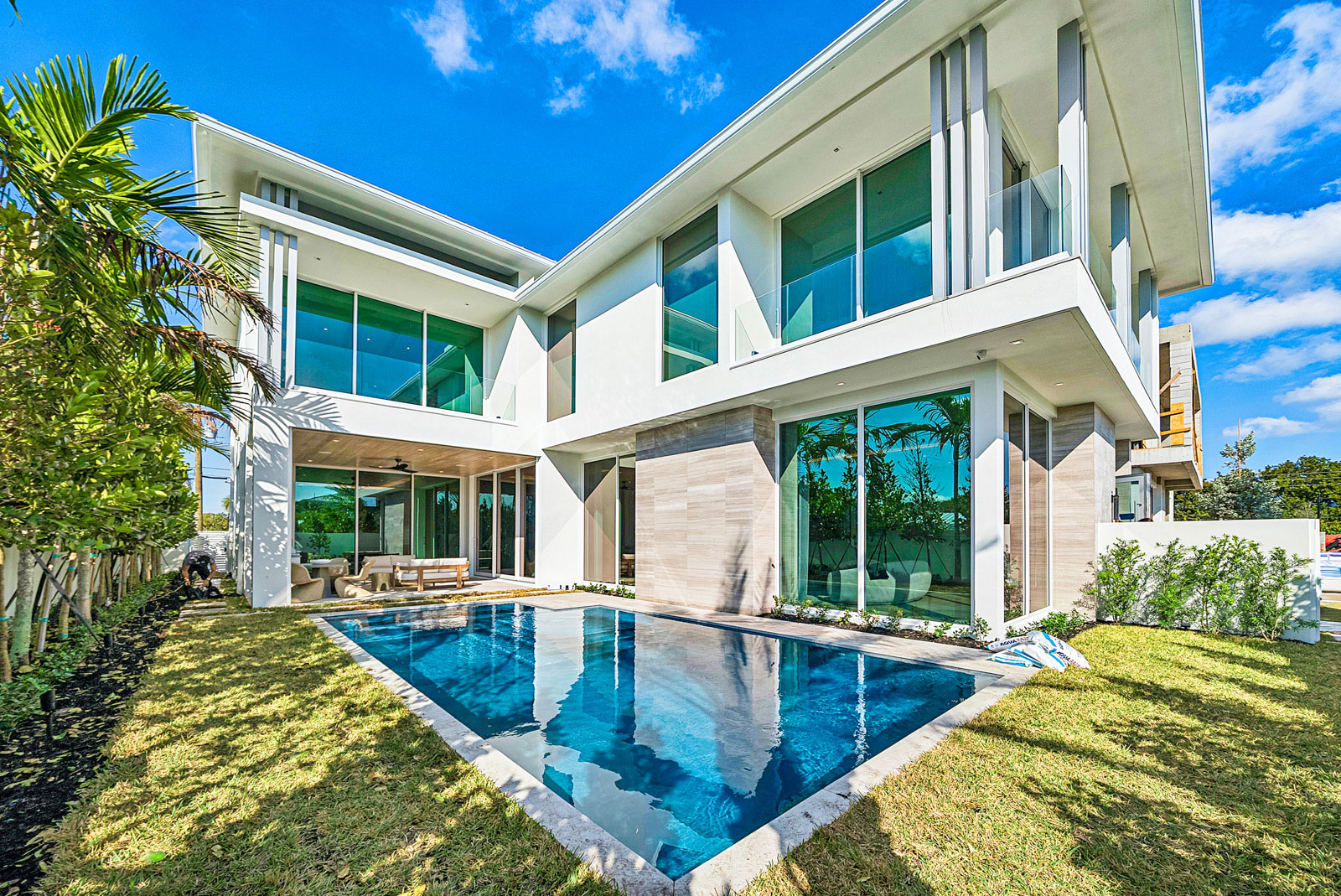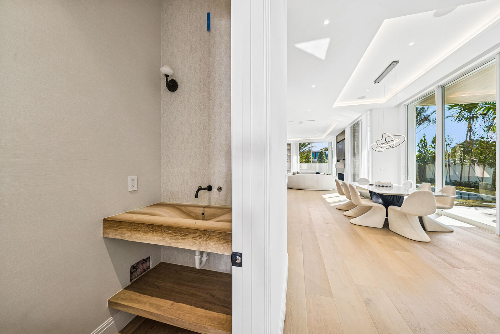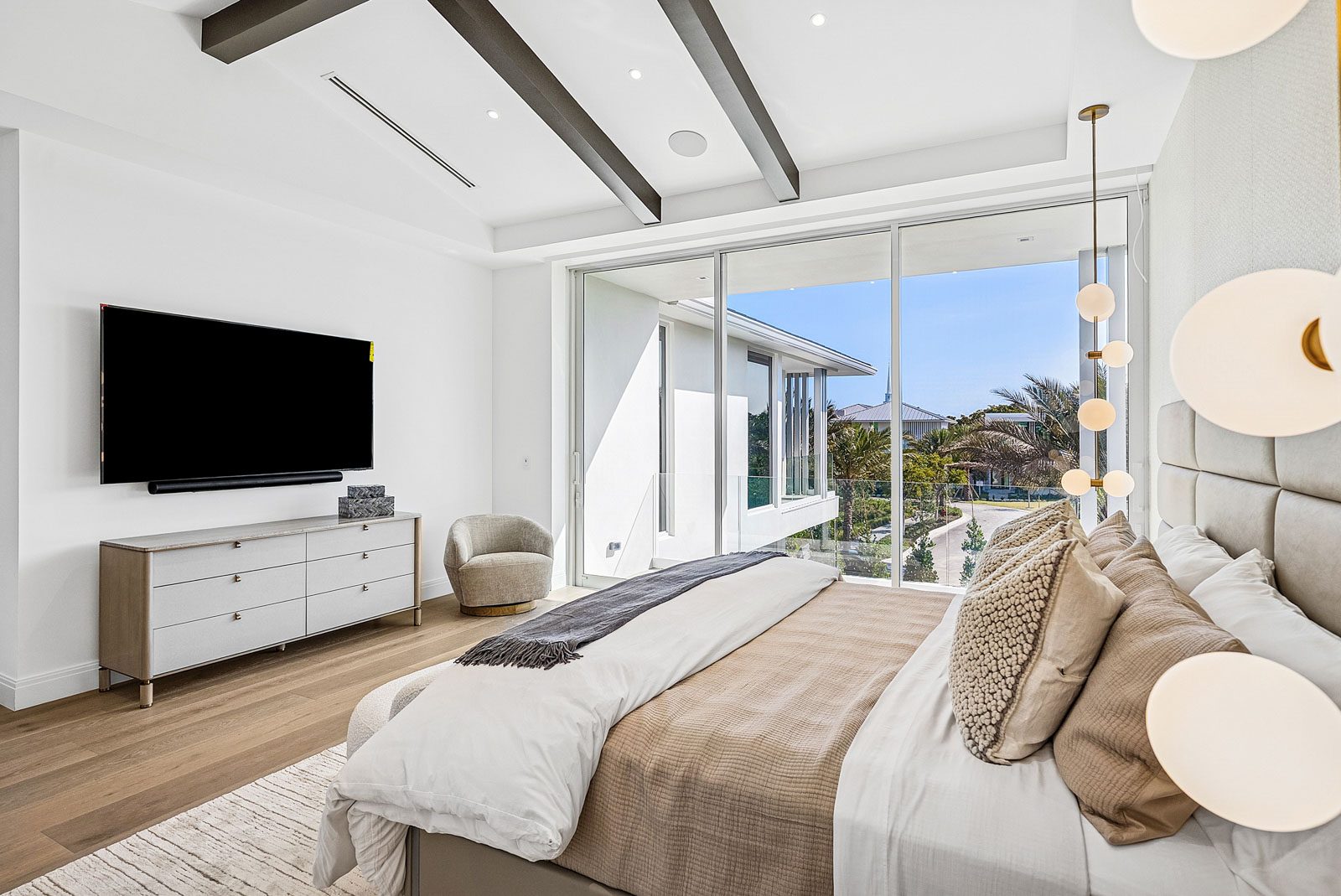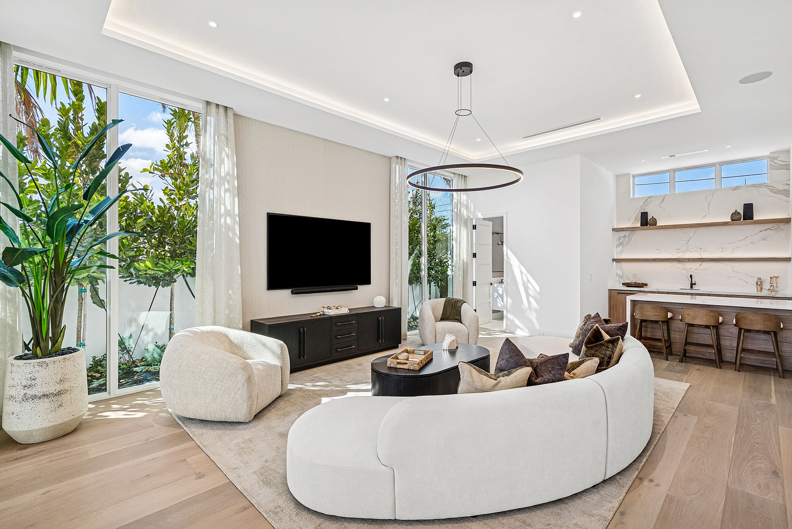 Sprawling two story home with 12’ high floor to ceiling glass on ground floor and 10’ floor to ceiling glass on second floor
