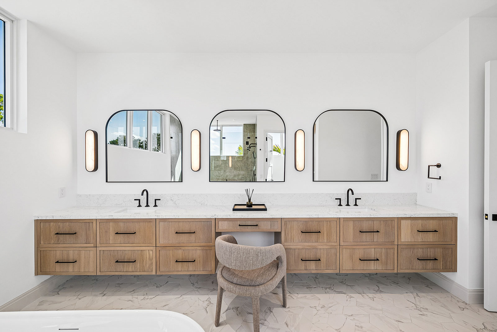 Floating staircase with white oak treads, elevator and natural gas fireplace with custom surround