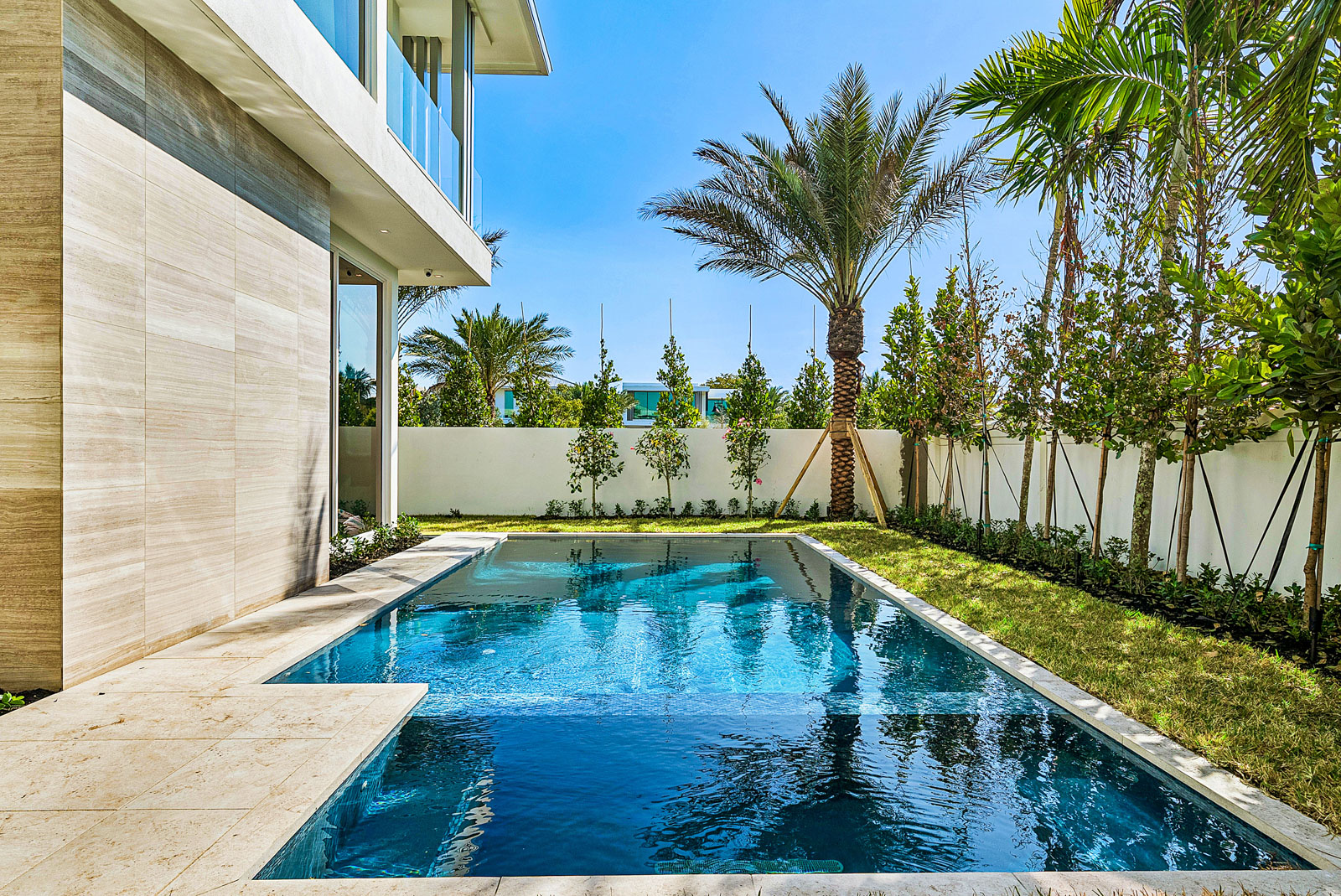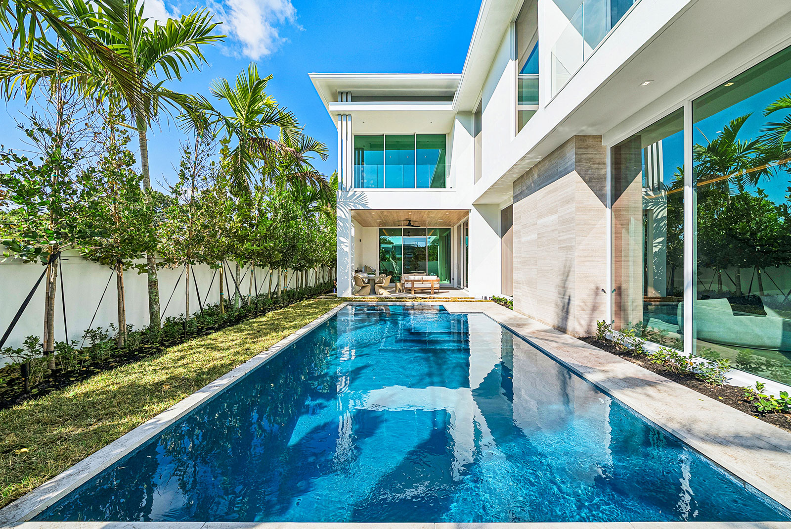 Expansive balconies with glass railings overlooking lushly landscaped central green