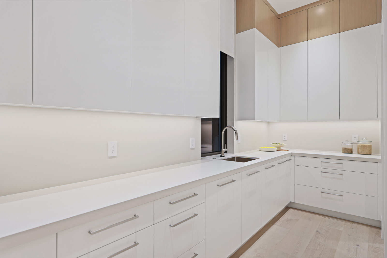 Kitchen features Wolf and Sub Zero appliances, 12’ floor to ceiling cabinetry and service kitchen with walk-in pantry