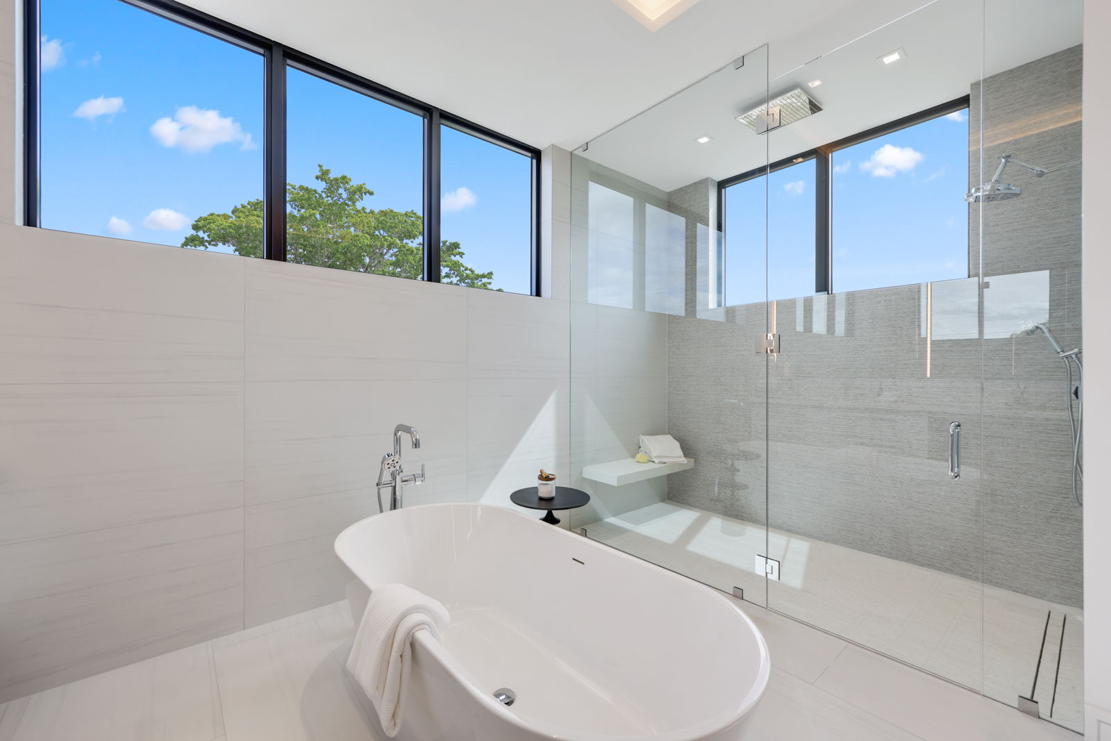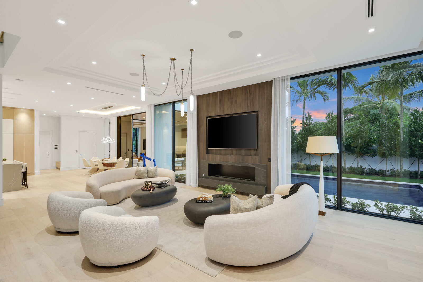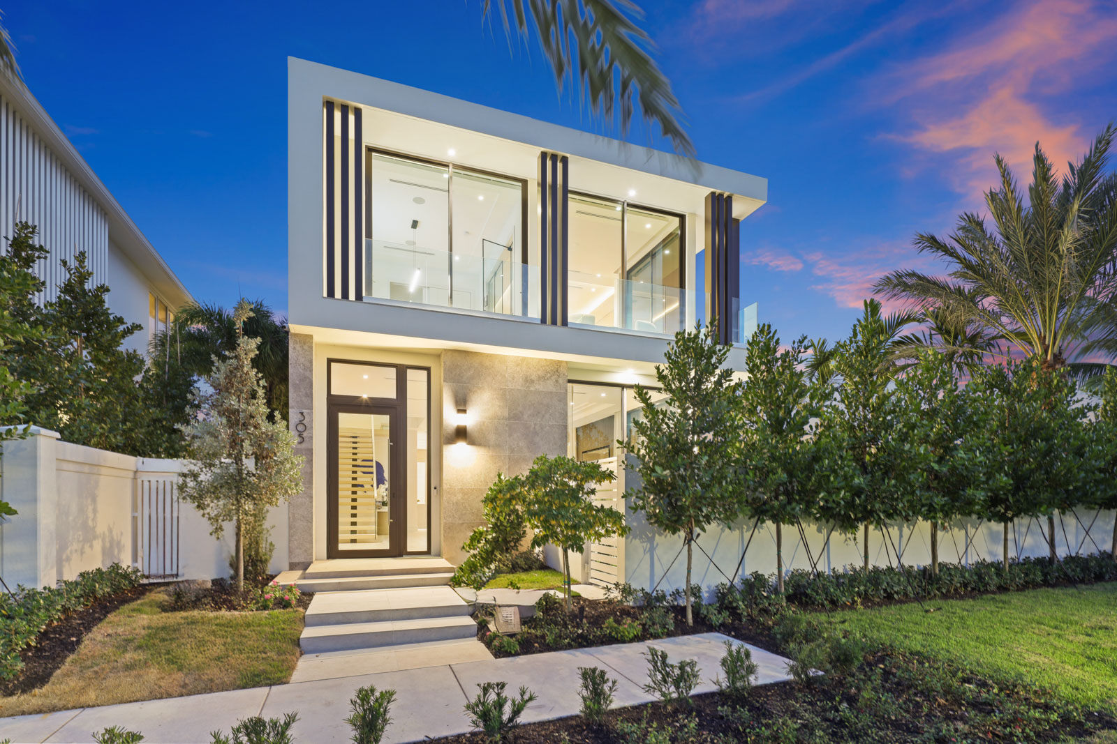 Sprawling two story home with 12’ high floor to ceiling glass on ground floor and 10’ floor to ceiling glass on second floor