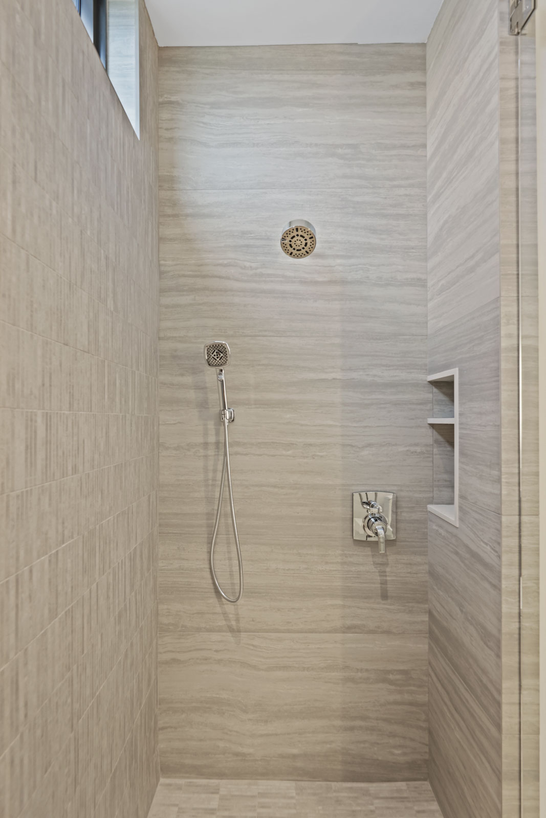 Floating staircase with white oak treads, elevator and natural gas fireplace with custom surround