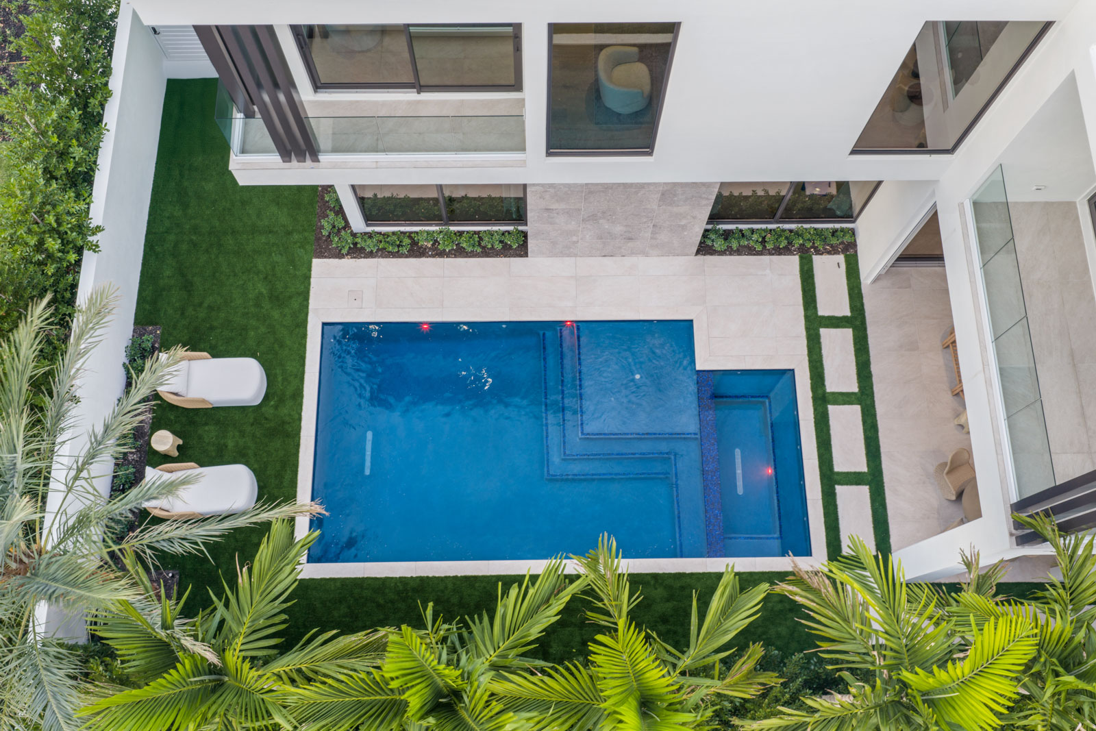 Expansive balconies with glass railings overlooking lushly landscaped central green