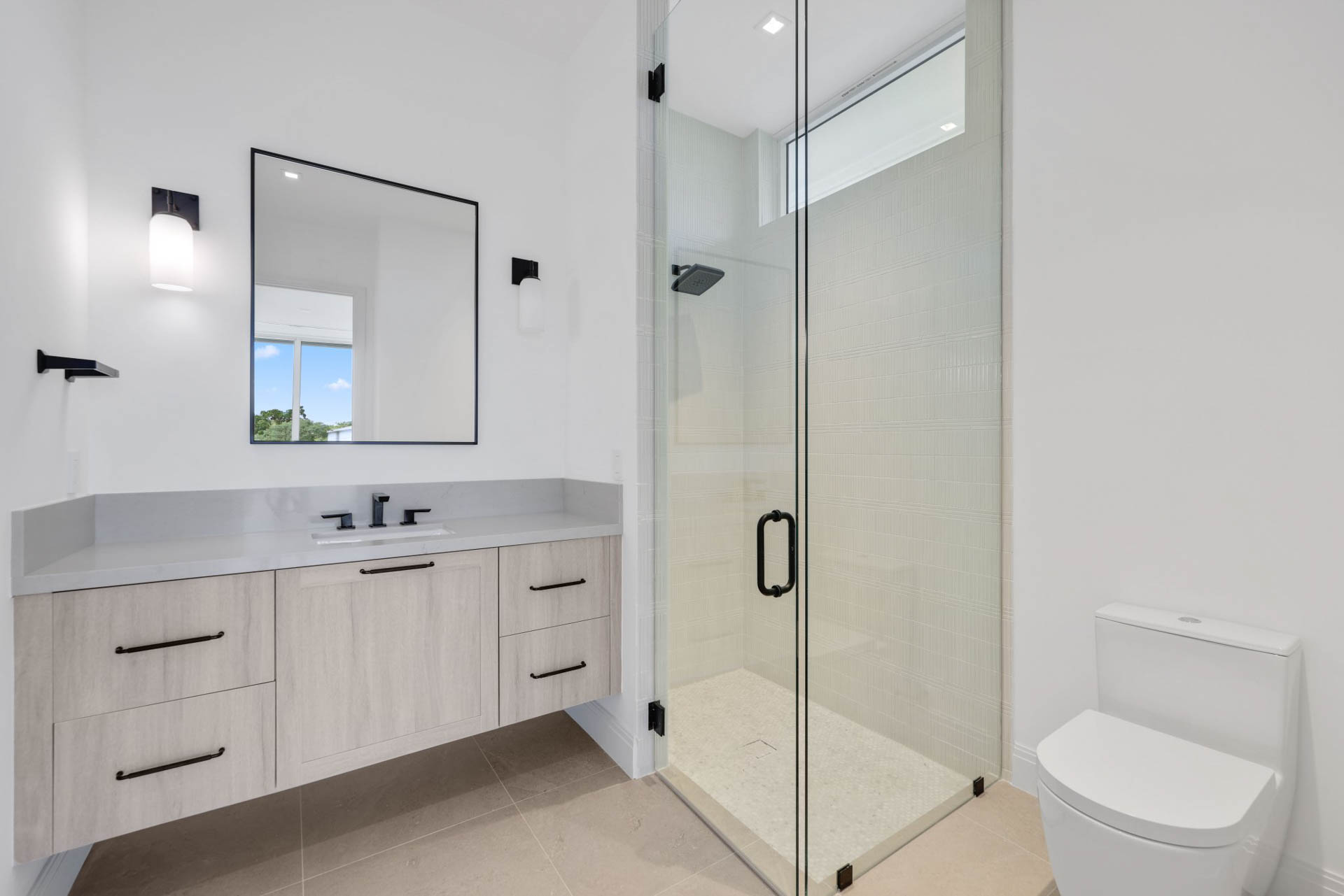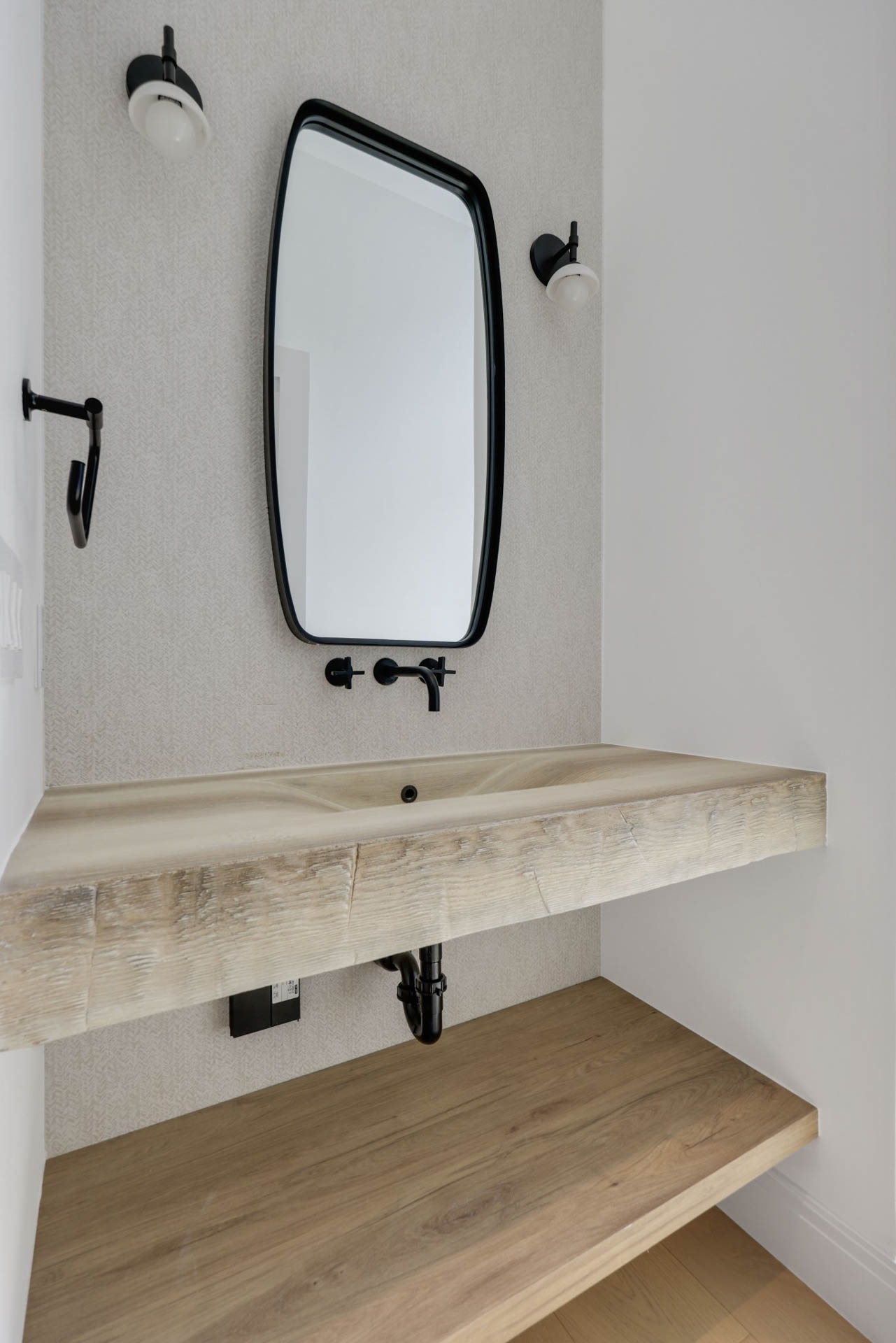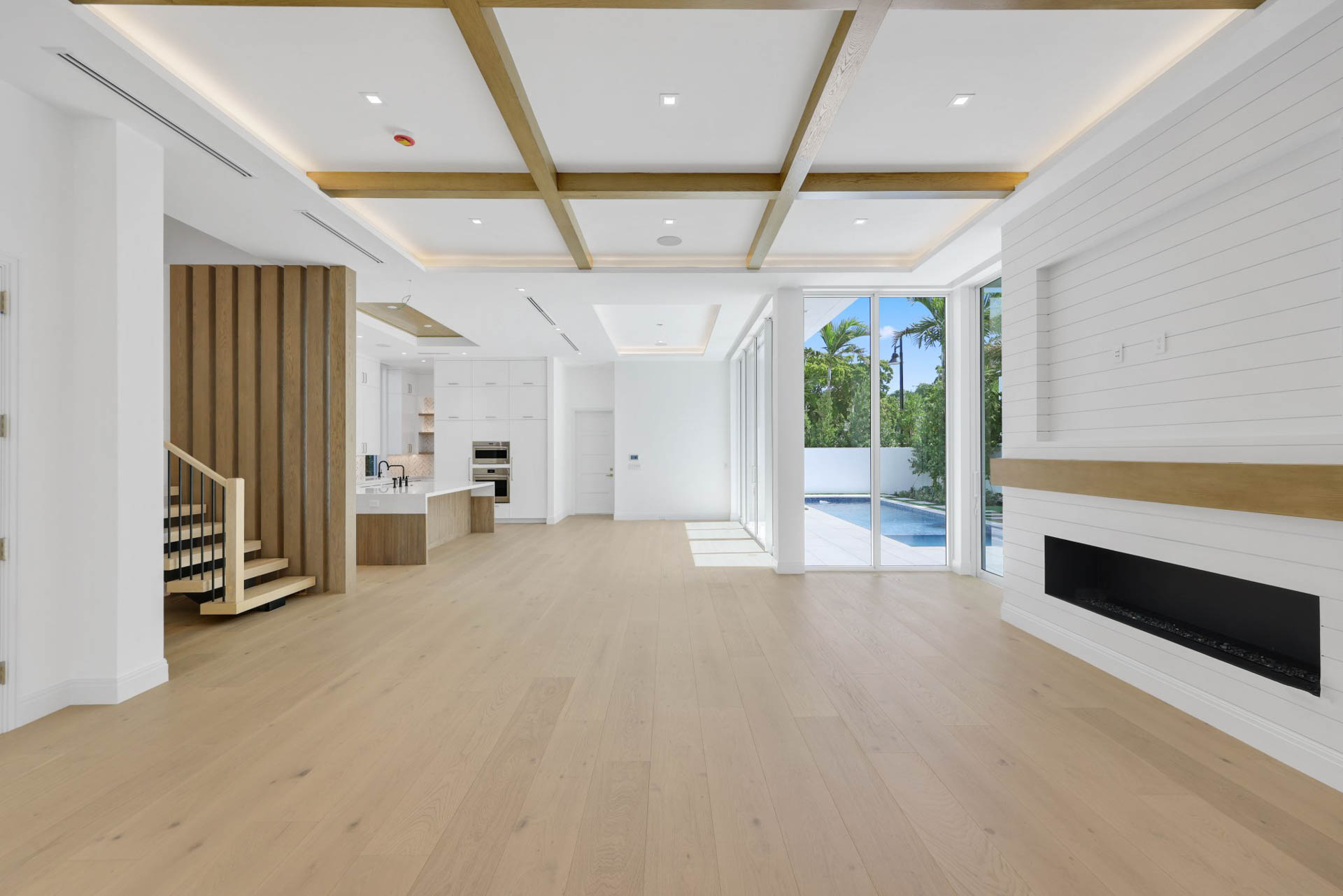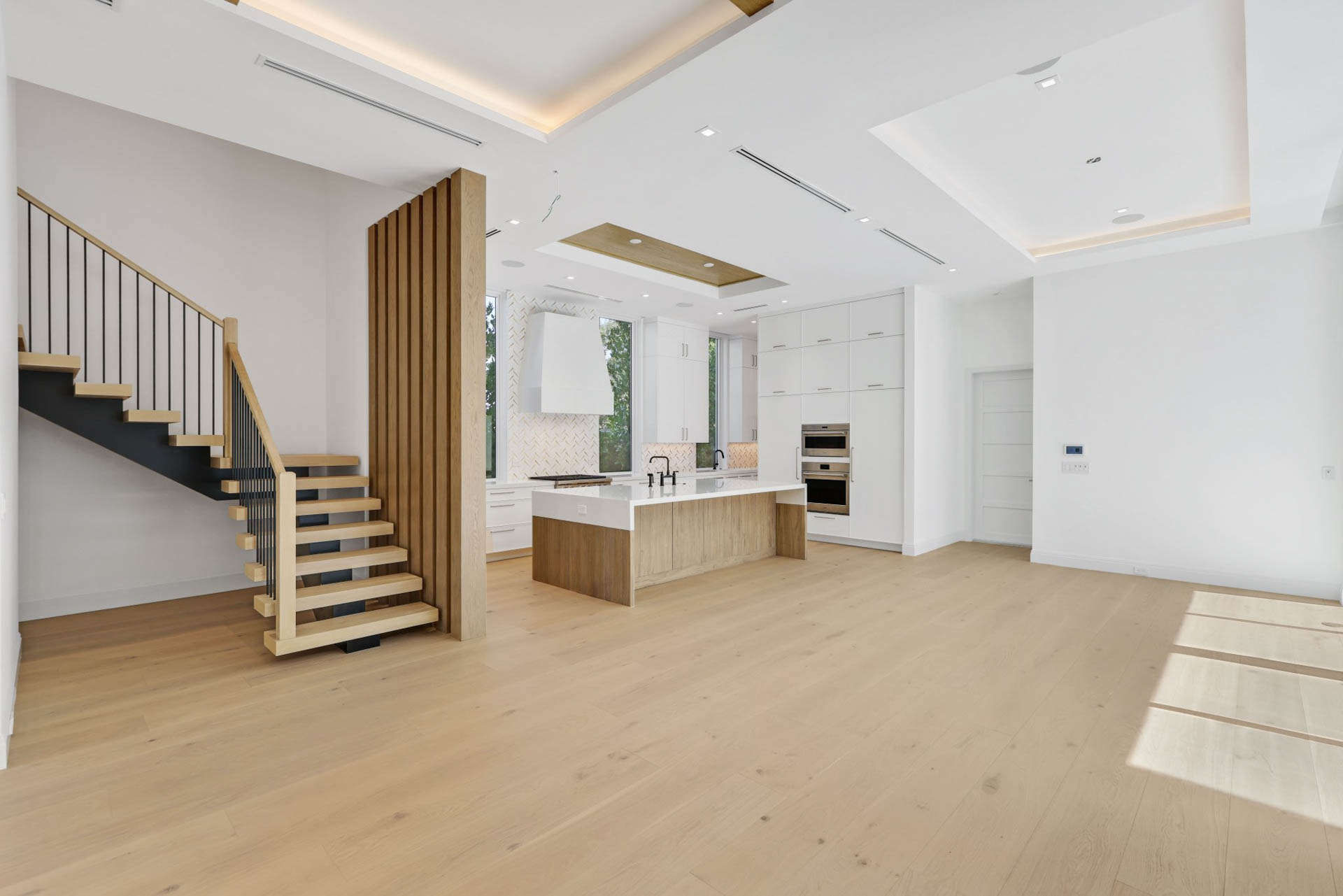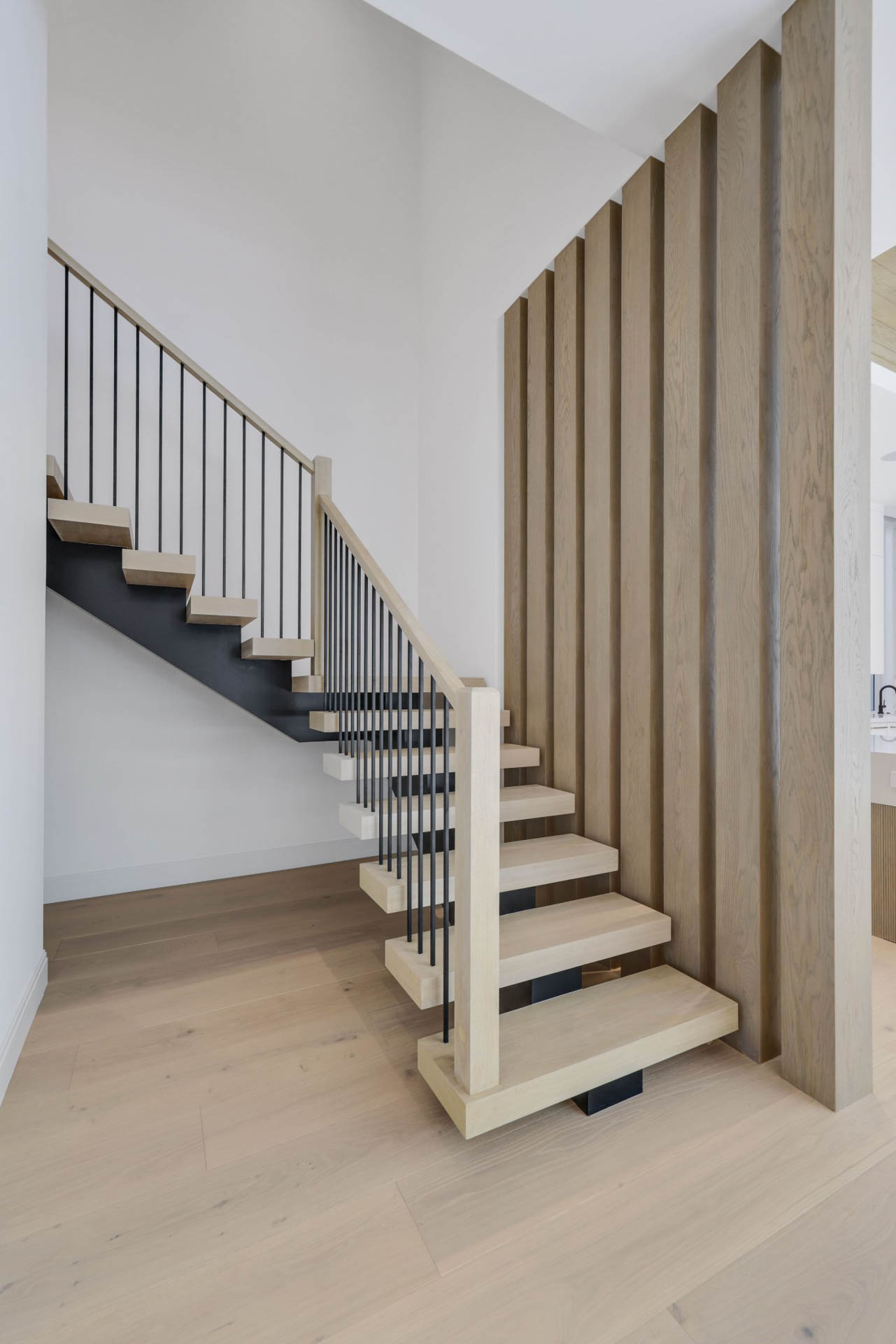 Floating staircase with white oak treads, elevator and natural gas fireplace with custom surround