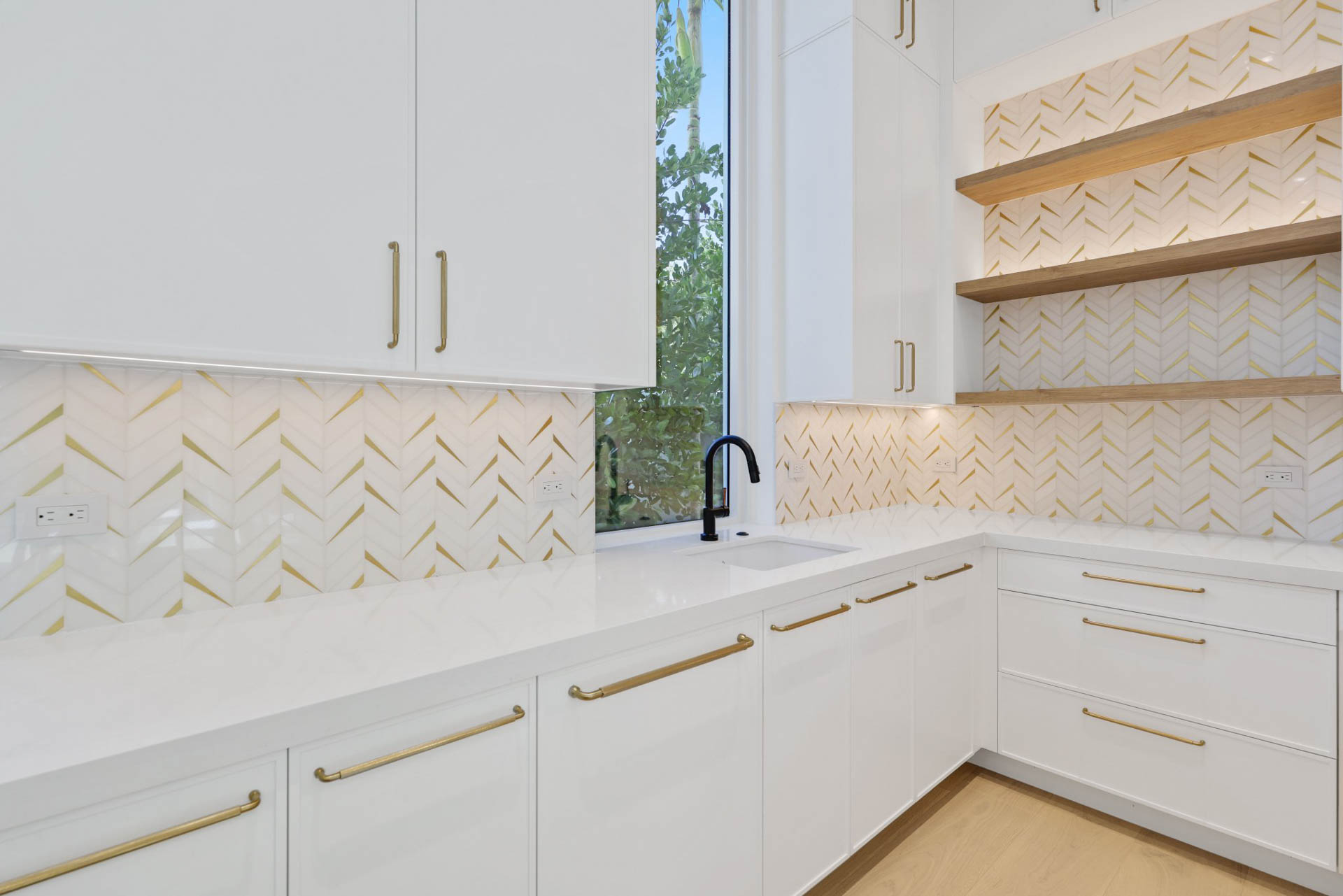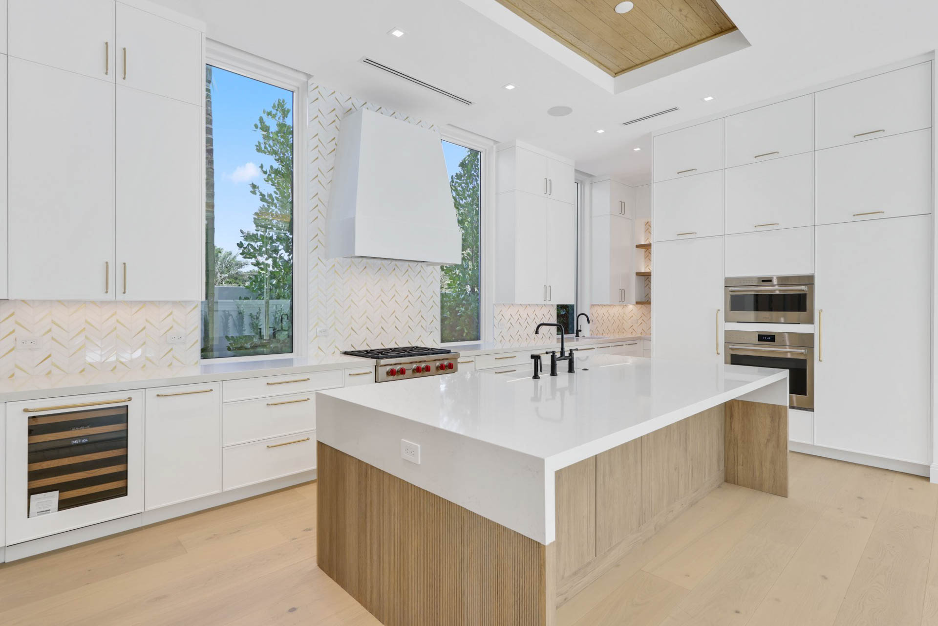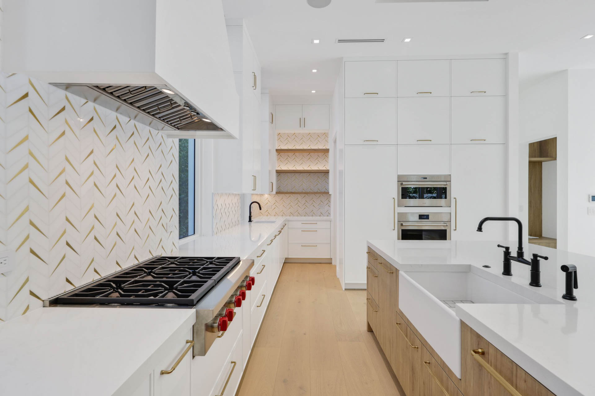 Kitchen features Wolf and Sub Zero appliances, 12’ floor to ceiling cabinetry and service kitchen with walk-in pantry