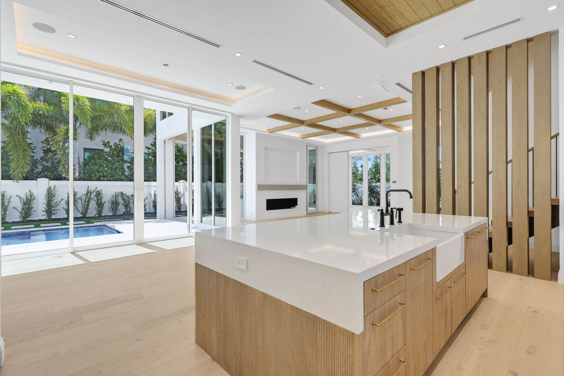 Large covered outdoor entertaining area with full summer kitchen and T&G ceiling with hidden pockets for automated screens