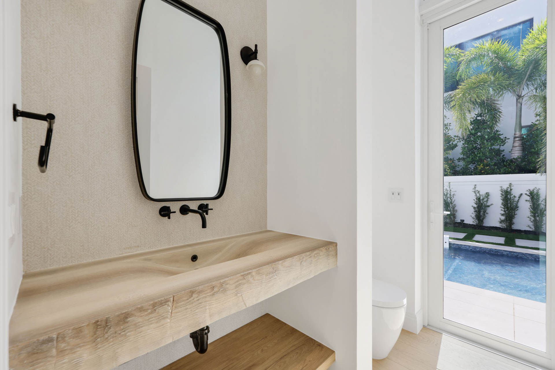 Salt water pool with spa and sun shelf surrounded by heavy landscaping for complete privacy