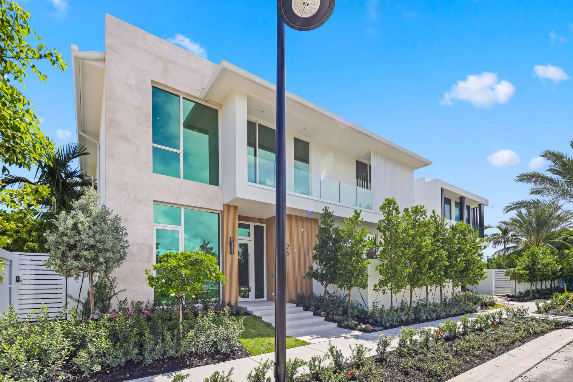 Expansive balconies with glass railings overlooking lushly landscaped central green